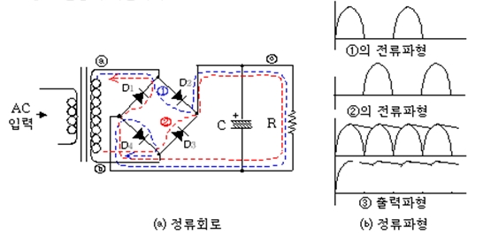 그림(Fig03) ⒜정류회로의 ⓐ단자의 파형이 '+'가 되는 순간 D2, D4는 순방향 전압이 걸리게 되어 Diode는 ON상태가 되어 ①의 점선방향으로 정류전류가 흘러서 그림(Fig03) ⒝정류파형의 ①과 같은 출력파형이 C에 충전된다. 이때 D1, D3은 역방향 전압이 걸려 OFF상태가 된다. 위상이 바뀌어 ⓑ단자가 '+'일 때는 D1, D3이 순방향 전압이 걸리게 되어 이 Diode는 ON상태가 되어 ②의 점선방향으로 정류전류가 흘러 그림(Fig03) ⒝정류파형의 ②와 같은 출력파형이 C에 충전된다. 또한 D2, D4는 OFF상태가 된다. 계속해서 ①, ②의 방향의 정류전류가 교대로 흘러 출력전압의 ⓒ파형은 그림(Fig03) ⒝정류파형의 ③과 같이 된다.