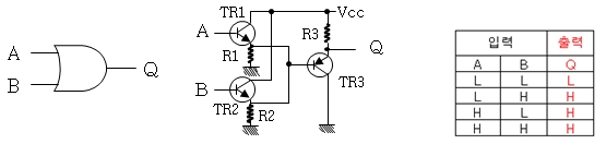 OR 게이트도 AND 게이트와 같이 두 개 또는 그 이상의 입력과 출력을 갖는다. OR 게이트의 연산은 입력의 어느 하나라도 High이면 출력이 High가 되고 입력이 모두 Low일 때만 출력이 Low가 된다.