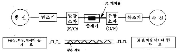 광통신 방식이란 파장이 0.8~1.7㎛ 정도의 가시광선으로부터 근적외선을 정보전달 매체로하는 통신시스템으로서 DATA통신에서 전자계산기와 단말장치와의 연결통신 회선선로방식으로 전송매체로 광 화이버를 사용하는 통신 시스템이다.(데이터통신 참고)