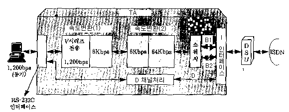 그림은 그 대표적인 예로서 V.110에 따른 TA의 구성을 나타낸 것이다. PC로부터 송신된 1200bps(동기)의 데이터 신호는 TA내에서 일단 8kbps의 속도로 변환된 후 64kbps로 변환된다. 이와같이 V.110에서는 접속된 단말의 통신속도를 중간속도(8k, 16k 또는 64kbps)를 거쳐 2단계를 통해 64kbps로 변환하고 있다.