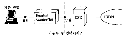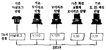 기존의 단말을 ISDN에 연결하기 위해서는 그림(Fig03)에 나타낸 바와 같이 단말과 이용자 망 인터페이스점(T점) 사이에 접속조건(프로토콜)을 변환기키는 장치를 설치할 필요가 있다. 이 장치를 터미널 어뎁터(TA : Terminal Adaptor)라고 부른다. TA에는 사용하는 단말과 접속조건에 따라 몇가지 종류가 있다. 크게 나누면 첫째 일반 전화기나 G3 팩시밀리 등의 아날로그 단말을 접속하기 위한 TA, 둘째 데이터 단말 등의 회선교환용 디지털 통신단말을 접속하기 위한 TA, 셋째 패킷통신용 단말을 접속하기 위한 TA의 3종류가 있다. 이중 2번째의 경우는 전화망을 사용하여 데이터 통신을 실행하기 위한 V 시리즈 인터페이스를 갖춘 단말용과 디지털 데이터통망을 이용하기 위한 X 시리즈 인터페이스를 갖춘 단말용으로 나누어진다.그림(Fig04)