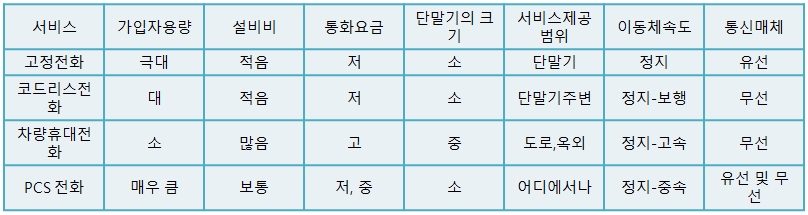 고정전화는 통화밀집도에 관계없이 서비스 제공이 가능하고 휴대전화는 통화밀집도가 낮은 넓은 지역에서 서비스 제공이 가능하나 PCN 서비스는 고정전화화 같은 높은 수준의 통화밀집도에서 가능하도록 해야 한다. PCN 서비스와 다른 서비스와의 비교를 요약 설명하면 아래의 [표]와 같다.