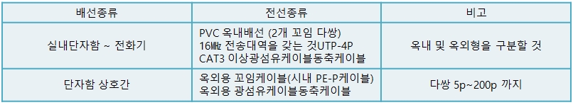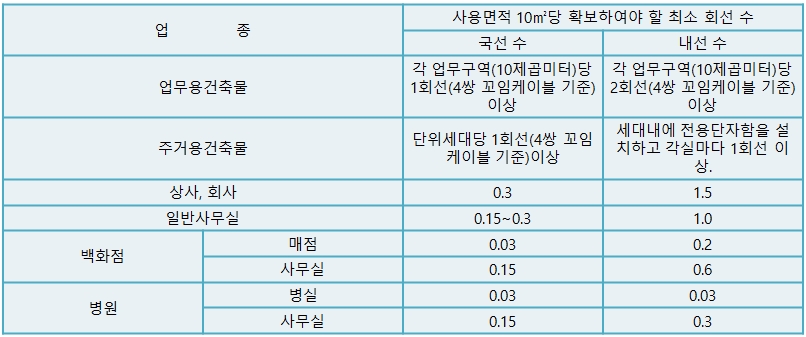 · 업무용 및 기타건축물의 경우에는 각 실별(고정된 벽 등으로 반영구적으로 구분된 장소) 단위로 제1항의 통신용 인출구 또는 통신용 단자함으로 종단하여야 한다.