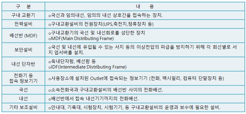 전화설비는 외부와 내부 또는 내부 상호간에 정보(음성, 데이터, 문자, 영상 등)의 송수신 및 전화연락을 하기 위한 장치로서, 구내교환기는 회선을 집약하여 사용효율을 높이고 전화설비의 경제적인 이용을 위해 설치되고 있다.