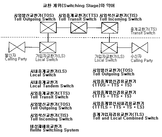 대규모 통신망은 몇 계위의 계층구조(hiersrchical structure)로 구성되는 것이 일반적이다. 그 구성방법은 나라에 따라 약간씩 다르나 대체로 기본구조는 유사하며 그림(Fig04)과 같이 4계위망으로 구성된다. 즉 가입자에서 가까운 쪽부터 차례로 단국(EO : End office), 집중국(TC : Toll Center), 중심국(DC : Disrict Center), 총괄국(RC : Regional Center)을 말한다. 이에 비새 국토가 넓고 가입자수가 많은 북미지역에서는 5계위망을 채용하고 있다.