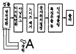 · "예" 문자인식을 하는 OCR(광학 문자 판독장치)에서는 그림과 같이 광전 변환장치에 의해 신호를 검출하여 얻은 아날로그량을 디지털량으로 변환하여 노이즈를 제거하고 문자의 위치결정 샘플링, 특징 추출 등을 하여 문자에 따른 출력을 인출한다.