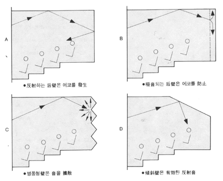 凸(볼록한)면에서의 반사는 실내의 반사음을 확산하게 하는 경향이 있고, 凹(오목할)면은 집중하는 경향이 있다. 그러나 음파는 음의 파장( C : 음속, F : 주파수)과 반사체 또는 확산체의 효과에 따라 달라진다.