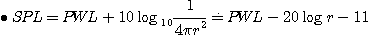 또한, 음원의 위치가 고정된 점(點)음원일 때 음원에서 최초의 거리 L1 과 다음의 거리 L2의 2점간의 음압레벨(SPL)은 다음 식으로 계산한