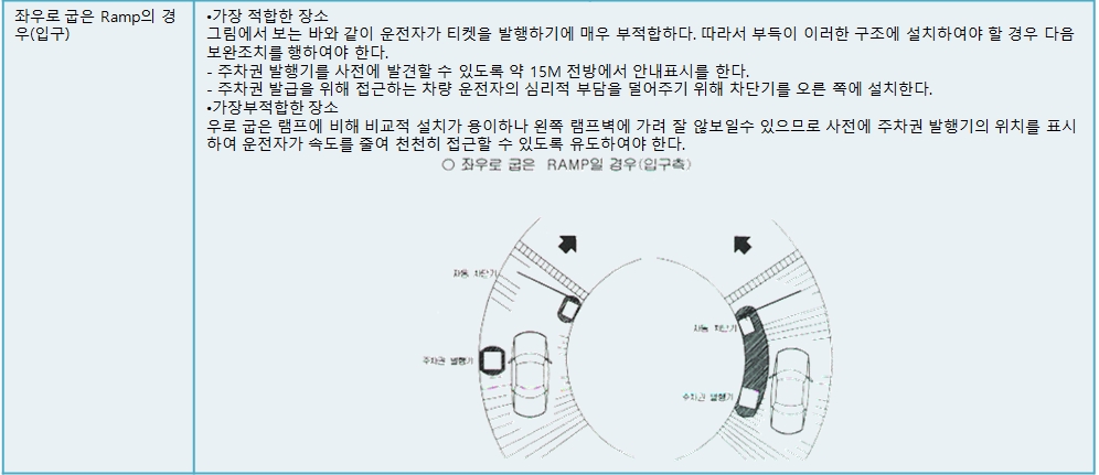 - 주변도로와 직각으로 만나는 위치는 주차권을 뽑거나 요금을 계산하기가 어렵다.