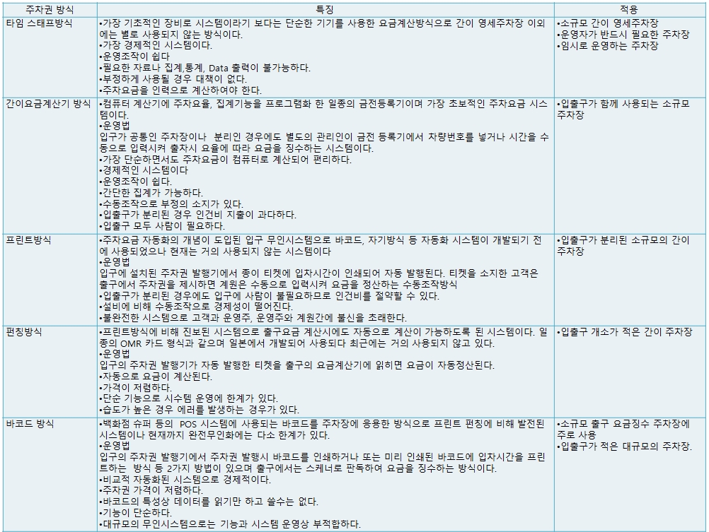 주차요금을 징수할 수 있는 방식에는 주차장의 규모, 경제성, 용도에 따라 여러 가지를 채택할 수 있다. 따라서 시스템의 선정시에는 가장 해당 주차장에 적합한 가를 파악하는 것이 주차요금시스템의 선정시 선결사항이다.