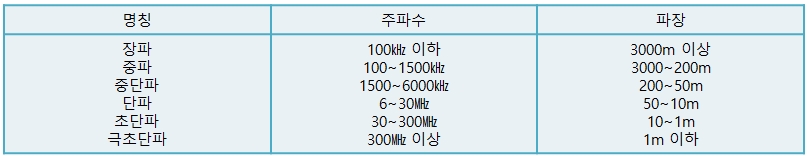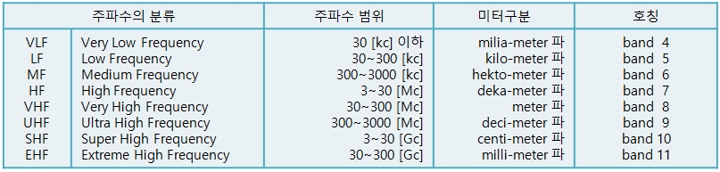실용상 우리가 흔히 말하는 장파, 중파, 중단파, 단파, 초단파, 극초단파의 주파수에 의한 분류는 표와 같다.