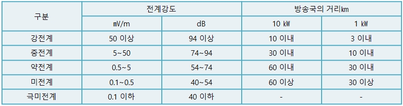 전계강도는 방송국의 거리와 방송국의 송신전력이 관계된다. 개략치로서 전계강도를 분류하면 표와 같다.