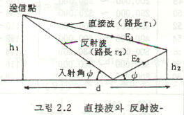 그러나 구면 대지가 존재하면 그림 2.2와 같이 전계강도는 직접파와 지표에서의 반사파와 합성이 된다.