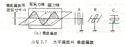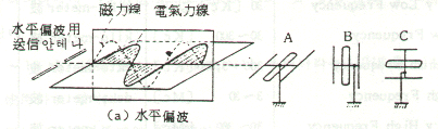 그림 2.7(a)와 같이 안테나가 수평인 때에는 자기력선의 파동이 대지에 대하여 수평면 내에 생기고 자력선의 파동은 대지에 대하여 수직면 내에 생긴다. 이와같은 전자파를 수평편파라고 한다. 이것을 수신하려면 자기력선에 평행인 수평안테나만이 유효하고 B나 C와 같은 안테나로서는 수신전압이 약하다.