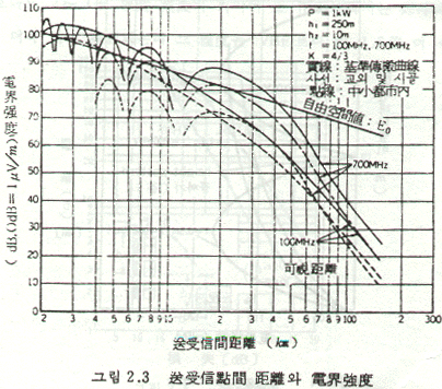 UHF전파는 그림 2.4에도 명백한 바와 같이 이론적으로 전파가 퍼져가기 쉽지만 실제로는 지구의 곡률의 영향이나 건조물, 지형의 변화 등에 의한 전파의 감쇄는 VHF보다 커서 전계강도는 이론치보다 상당히 적어진다.