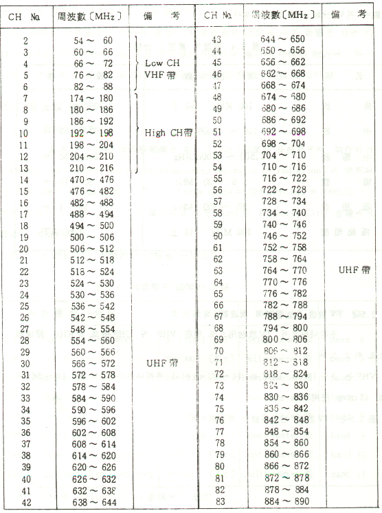 VHF는 2~13ch, UHF는 14~83ch까지 이지만 국내에서는 14~56ch로 43ch를 사용하고 있다.