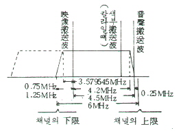 · 영상전파와 음성반송파는 서로 영향을 주지 않도록 4.5㎒ 떼어 1개 채널 당의 주파수 대역폭으로 영상신호를 보내어 그림2-1과 같은 상측파의 전부와 하측파의 일부를 송신하는 잔류 側波帶(VSB)방식을 사용하고 있다.