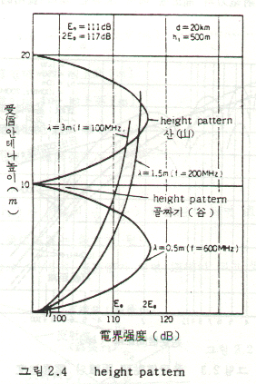 · UHF 전파는 수신안테나의 높이가 파장에 비해 크게 되기 때문에 그림 2.4에 나타나는 것처럼 안테나의 높이를 바꾸면 전파세기의 변화(height pattern)가 현저하게 나타난다.