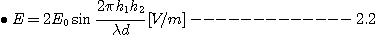 반사파의 크기는 대지에서 반사하면 위상은 역전되지만 전파의 크기는 거의 같은 세기로 들어간다. 그리고 두 개의 通路長差(r2 - r1)에 의해서 위상차가 가능하므로 수신점에서의 전계강도 E는 다음과 같다.