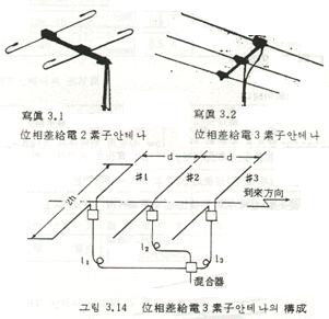 그림 3.15와 같이 수평2기 합성안테나 각각에 급전선을 접속하고 한 개의 급전선에 移相회로를 삽입해 혼합한 안테나이다. 위상조정기로 위상을 0°~360°로 변화시키면 합성안테나의 지향성이 변화하는데 이때에 지향성의 null point 각도가 변화한다. 따라서 반사파의 도래방향과 null point가 일치하면 ghost는 대폭 경감된다. 특히 전방에서 도래한 ghost에 대해 효과가 커서 1 rank 이상의 화질을 개선할 수 있다.