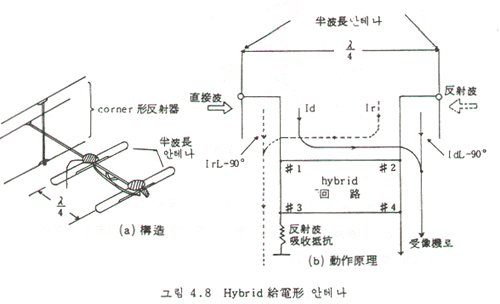 2개의 반파장 안테나와 hybrid 회로를 조합한 것으로 후방에 corner형 반사기가 부착되어 있으며 전후비 개선에 효과가 있다. 그 구조 및 동작원리는 그림 4.8과 같다.
