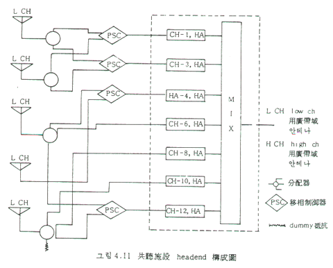 low ch용 광대역 5소자 야기안테나 2기, high ch 광대역 8소자 야기 안테나 3기를 그림4.11과 같이 구성하여 사용한 결과 특히 불량한 1,3,4,12 ch에서는 이상기를 사용하여 안테나를 합성했다. 대책의 결과는 표4.4와 같이 빌딩밀집지역이 복잡한 반사파가 존재하고 있는 수신점에서 개선책으로는 성공한 경우이다.