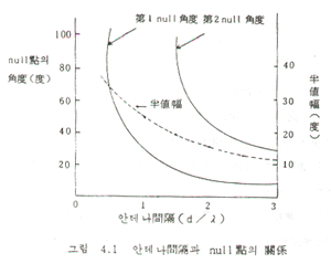 합성기는 T형 콘넥터 또눈 혼합기(2분배기를 역접속해서 사용가능)가 사용되고 있다. 2기의 안테나 간섭을 변화하면 主 rope와 副 rope의 발생상태가 변화되므로 그 경우 主 rope의 반치폭과 null점의 각도 변화상태는 그림 4.1과 같이 된다.