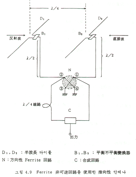 2개의 반파장 안테나와 ferrite 비가역회로를 조합한 것으로 그림 4.9에 구성을 표시한다. 반사파에 대해서는 높은 임피던스로 직접파에 대해서는 통전상태가 되고 광대역에서는 높은 전후비(25dB 이상)를 얻는다.