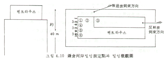 약 70도 방향에서 고층빌딩의 반사파가 들어오고 있다. 전대역용 10소자 야기 안테나로 측정점 ①~⑥(그림 4.10참조)을 측정한 결과 표4.3의 수신레벨과 화질평가를 얻었다. 이것으로 판단한 결과 수신점을 변경하여도 전 채널이 모두 불량하고 1,3,4,12 ch이 특히 불량하였다.