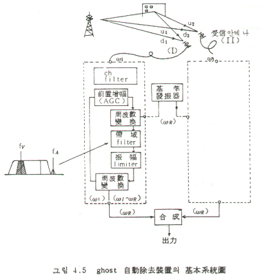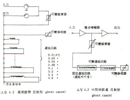 희망파 신호는 거의 손실이 아닌 것만 통과하고 ghost 신호에 대해서는 희망파의 일부를 지연시킨 신호와 역상으로 합성에 의해 ghost를 경감하는 방식으로 파형等化器의 일종이다. 지연회로에 의해 실제 ghost를 제거하는 장치로는 고조파대 반사형 ghost cancel과 중간주파대 반사형 ghost cenal이 있다. 그 구성은 그림 4.2와 4.3과 같다.