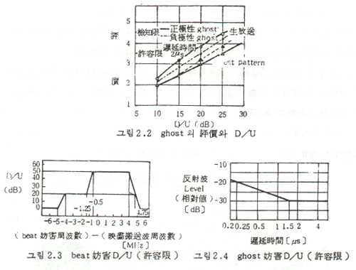 평가는 주관적이기 때문에 개인차가 있어 제각기 다르며 측정기술의 진보에 따라 비교적 간단하게 방해량을 측정할 수 있게 되었다. 화질평가와 양적관계는 표2.3 및 그림 2.2, 2.3, 2.4 와 같다. 이 그림들로 알 수 있는 바와 같이 beat에 대해서는 주파수, ghost에 대해서는 지각시간에 따라 다르기 때문에 주의를 요한다.