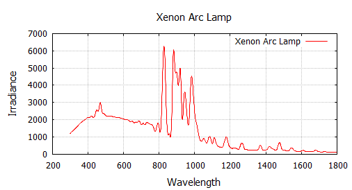 색온도는 약 6000k 이며 자연광처럼 자외선에서 적외선에 이르는 (185-2000 nm) 연속된 파장이 나옵니다. 특히 800-1000nm 적외선 대역의 파장이 강합니다. 제논 램프는 자외선이 나오는 특성 때문에 램프 주변의 공기에서 오존을 만들어 내는 효과가 있습니다. 이런 효과를 줄이기 위해 240nm 이하 파장을 차단하는 코팅이 되어있는 오존 프리(Ozone free) 기능 제품이 따로 있는 경우도 있습니다.