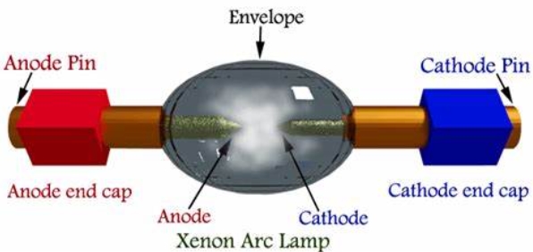 ① 쇼트아크 제논/크세논 램프(Short Arc Xenon Lamp) : 전극간격이 수 mm이고, 관이 공 또는 달걀 모양이다. 일반적으로 직류로 점등한다. 제논가스는 점등 중 20∼40기압이 된다. 점광원(點光源)으로 자연광에 가까우며 연색성(演色性)이 좋기 때문에 표준백색광원·영사·인쇄제판·퇴색(退色)시험·솔라시뮬레이터에 사용됩니다.