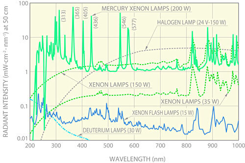 순수 제논과 함께 많이 쓰이는 수은 제논 램프는 자외선 출력이 강해서 자외선 경화 장치 등에 많이 쓰입니다. 위 표를 보면 제논 램프 출력별 차이와 할로겐, 중수소 램프의 파장 분포도 나와있습니다.