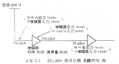 이득 30dB증폭기란 것은 입력레벨을 70dBμ로 하면 출력레벨은 110dBμ가 되는 것을 의미하지만 구체적으로는 2.2식처럼 증폭기가 약 3.2배의 증폭기이고 레벨의 상대치를 표시하고 있다.