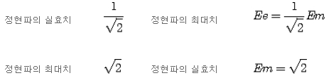 따라서 보통 정현파의 전압이 몇V라는 것은 이 실효치를 표시하므로 최대치는 √2배가 된다. 예를 들면 전압이 100V이면 실효치가 100V이고 최대치는 141V가 된다.