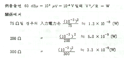 예를 들면 수신기의 입력레벨이 60dBμ라고 하는 것만으로는 불충분하다. 수신기의 입력에는 현재 75Ω, 200Ω, 300Ω 3종류가 있으나 입력레벨이 단순히 60dBμ라 해도 임피던스가 다르면 수신기의 입력전압은 다음과 같이 각각 다르기 때문이다.