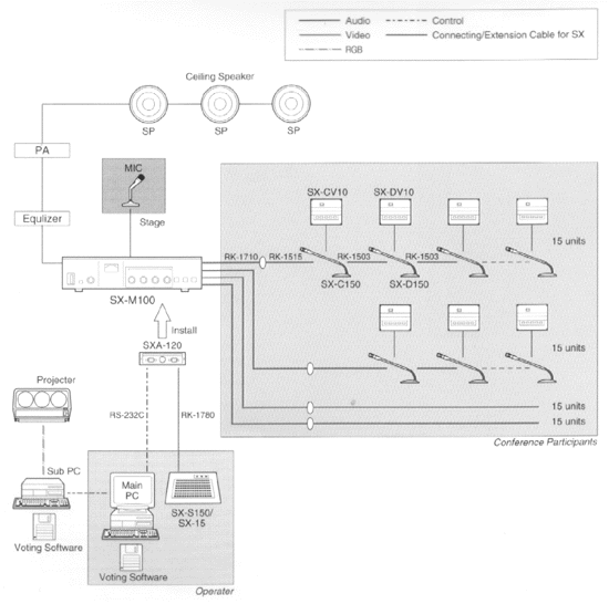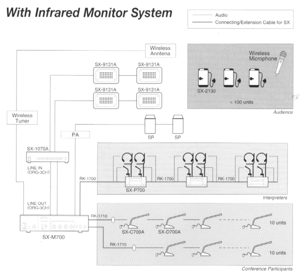 Audio System의 경우 동시통역부스, 동시통역 채널, 사회자 마이크, 사회자용 마이크 제어기, 발언자 마이크, 통역자 콘솔, 수신기 및 헤드폰, 인터폰, Voting-System 음향조정탁, 주변컴퓨터, 동력공급 유니트 등으로 구성되고, 회의 장 규모에 따라 화상제공이 필요하게 되는 경우 화상회의 시스템과 연계된다.