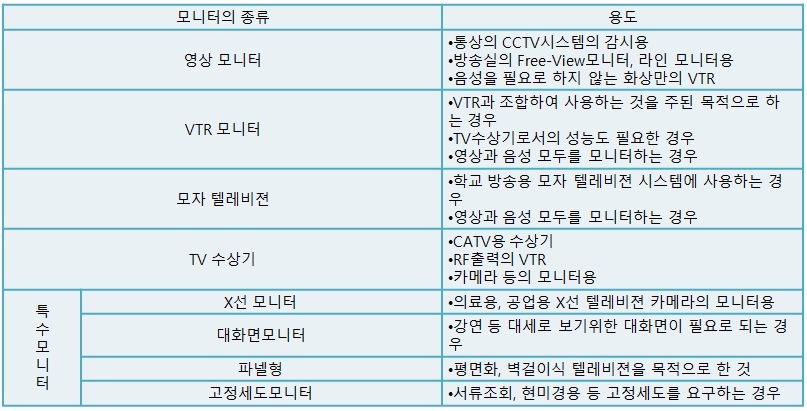 시스템이 목적으로 하고 있는 필요한 정보를 최종적으로 모니터 화상에 얻은 것으로 시스템에서 중요한 위치를 차지한다. 그 중요한 구성요소로서 모니터의 성능을 충분히 발휘시켜 장시간에 걸쳐 안정하게 동작시키기 위해 모니터 설치에는 다음의 각점에 유의하여야 한다.