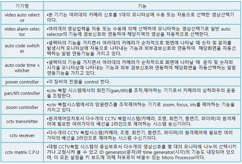 CCTV시스템의 기본구성요소는 촬상계(카메라부), 전송제어계(조작·제어부), 전송선로부, 수상계(기록,재생,화상처리계) 등으로 되어 있다.