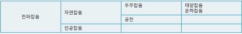 자연현상 즉, 번개, 눈보라, 폭우 등이 장중파帶에서 잡음 영향을 주는 것으로 그 종류는 다음과 같다. Grinder, Click, Hissing 등이 있다.