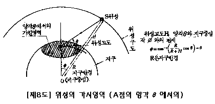 (제7도)에서와 같이 지금 한 지구국 A에서 가시할 수 있는 위성의 위치는 대체로 수평선(앙각 θ=0)이상의 영역에 있는 것으로 생각되나 대기의 굴절율에 의해서 지평선 이하에 있는 위성에서의 전파는 대기의 흩어짐, 다중로 전파 등으로 페이딩보다 크게 인정하지 않고 더욱 두꺼운 대기층, 전리층을 경사로 통과하므로 에너지의 흡수가 크고 수신 전계가 약하게 된다. 이들의 것은 저녁해가 물속에 잠기는 모양을 보면 납득이 갈 것으로 생각된다.