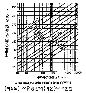 자유공간의(기본) 전파손실(송수신안테나가 모두 절대이득 1 즉, 0dB일 때의 전파손실)은 식(3) 제5도에 표시하고 있다. 또 식(1)을 사용하면 수동위성 및 능동위성으로 중계할 경우의 유효수신전력 Par은