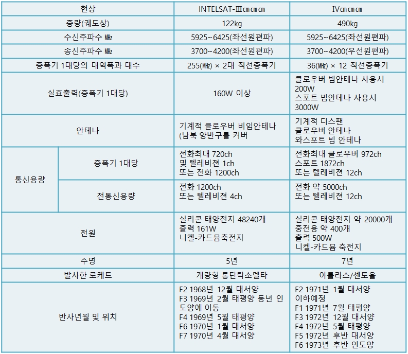 인텔셋트 Ⅲ호계 위성과 1970년대 위성통신 수요에 대처하기 위해 1971년 1월부터 쏘아 올려지고 있는 인텔셋트 Ⅳ호계 위성의 개관도와 제원을 제4도와 표2에 표시했다.