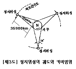 이에 대해 정지위성의 경우는 적도면상의 궤도에 3개의 위성을 120도의 간격으로 쏘아올려 두면 양 극지방을 제외한 전 세계를 포위하는 통신망이 가능하게 되는 것이다. (제3도) 아폴로 11호의 달 착륙의 모양을 알 게 한 전세계에 텔레비젼 중계는 인도양, 태평양, 대서양 상에 각각 쏘아올려 졌던 3개의 정지위성(인텔셋트 Ⅲ호계 위성)에 의해서 가능하게 된 것이다.
