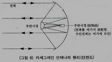 안테나는 접시모양의 반구형 반사경을 가진 구조이다. 그 반사면에서 전파를 위성으로 가는 빔으로 만들어 보내거나, 위성에서 온 전파를 한점으로 모아 수신하든가 한다. 반사면은 큰 쪽이 전파를 많이 모을 수 있어 유리하며, 카세그레인 안테나(Cassegrain antenna)가 널리 사용된다. 더 나아가 반사경에서 비스듬하게 반사시키도록 한 오프셋형도 사용된다. 전파를 목적하는 방향으로 집중시켜 다른곳으로 새어나가지 않도록 하는 것이 목적이다.