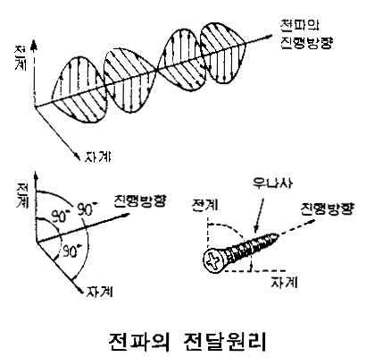 전파의 전달과정은 다음 그림과 같이 전계와 자계가 서로 직각을 이루어 주기적으로 변화하면서 공간을 퍼져나간다. 전계는 전하(Electric Charge)에 의하여 전기력이 미치는 공간을 말하며, 자계는 전계에 의하여 생성되는 자기력이 미치는 공간을 말한다. 전계와 자계는 "닭과 계란"의 관계와 같은 것인데 전계의 변화에 의하여 전계와 수직인 방향으로 자계가 형성되고 자계의 변화에 의하여 자계와 수직인 방향으로 전계가 형성된다. 전파의 전달은 전계와 자계에 수직인 방향으로 진행한다.