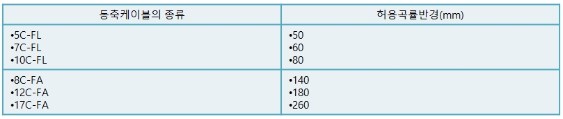 · 케이블의 허용곡률반경은 아래 표의 값 이상이어야 한다