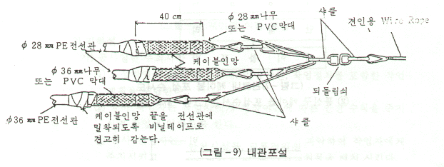 - PVC 관을 연결하여 선통을 하되 접속점을 철선으로 견고하게 묶어서 선통시 빠지지 않도록 하여야 한다.