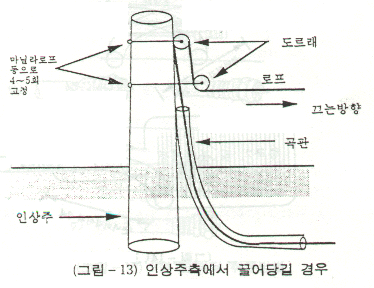 - 그림 13와 같이 인상주에 도르래 등을 설치하여 포설한다.